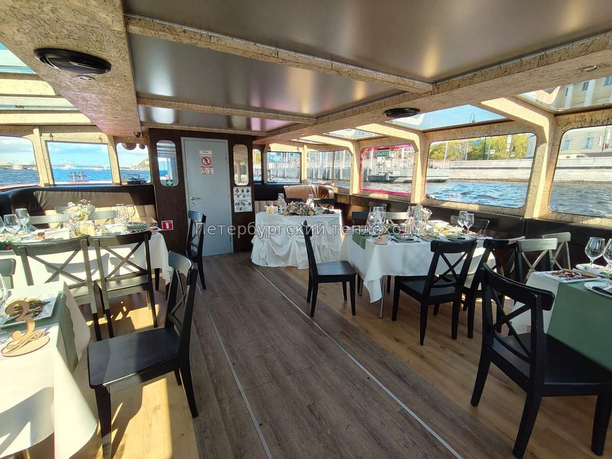 Теплоход имеет смотровую площадку на крыше. Эта площадь прекрасно подойдет для дискотеки под открытым небом. Интерьер нижнего салона имеет отделку из дуба и красного дерева. Прозрачный потолок и большие раздвижные окна делают банкетный зал более светлым и просторным и помогают более подробно рассмотреть достопримечательности Санкт-Петербурга. Салон имеет высокие потолки и большую площадь, что выгодно отличает этот теплоход от других судов этого класса. Для организации мероприятий (свадьба, корпоратив, выпускной) на теплоходе имеется всё необходимое оборудование: видео- и аудио аппаратура, TV, DVD, караоке.